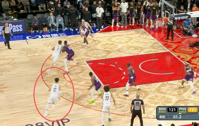 回到比賽當(dāng)中,曾凡博先給隊(duì)友進(jìn)行掩護(hù),接著進(jìn)入內(nèi)線(xiàn)讓籃網(wǎng)不得不換人,隨后直接來(lái)到右側(cè)45度三分線(xiàn)外,也是張開(kāi)雙手要球,這個(gè)時(shí)候他是沒(méi)有人防守的??赡们虻奈譅柗蛑苯訜o(wú)視,隨后選擇自己強(qiáng)突內(nèi)線(xiàn),沒(méi)有獲得好的出手機(jī)會(huì),只能強(qiáng)行出手,球也是沒(méi)有任何威脅,最終打鐵雙方進(jìn)入加時(shí)賽。