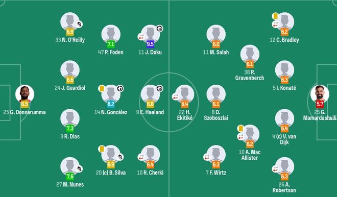 曼城首發(fā):25-多納魯馬、3-魯本·迪亞斯、24-格瓦迪奧爾、33-奧賴?yán)?7-努內(nèi)斯、4-尼科·岡薩雷斯、20-B席、10-謝爾基(53'26-薩維尼奧)、11-多庫(74'7-馬爾穆什)、47-福登、9-哈蘭德